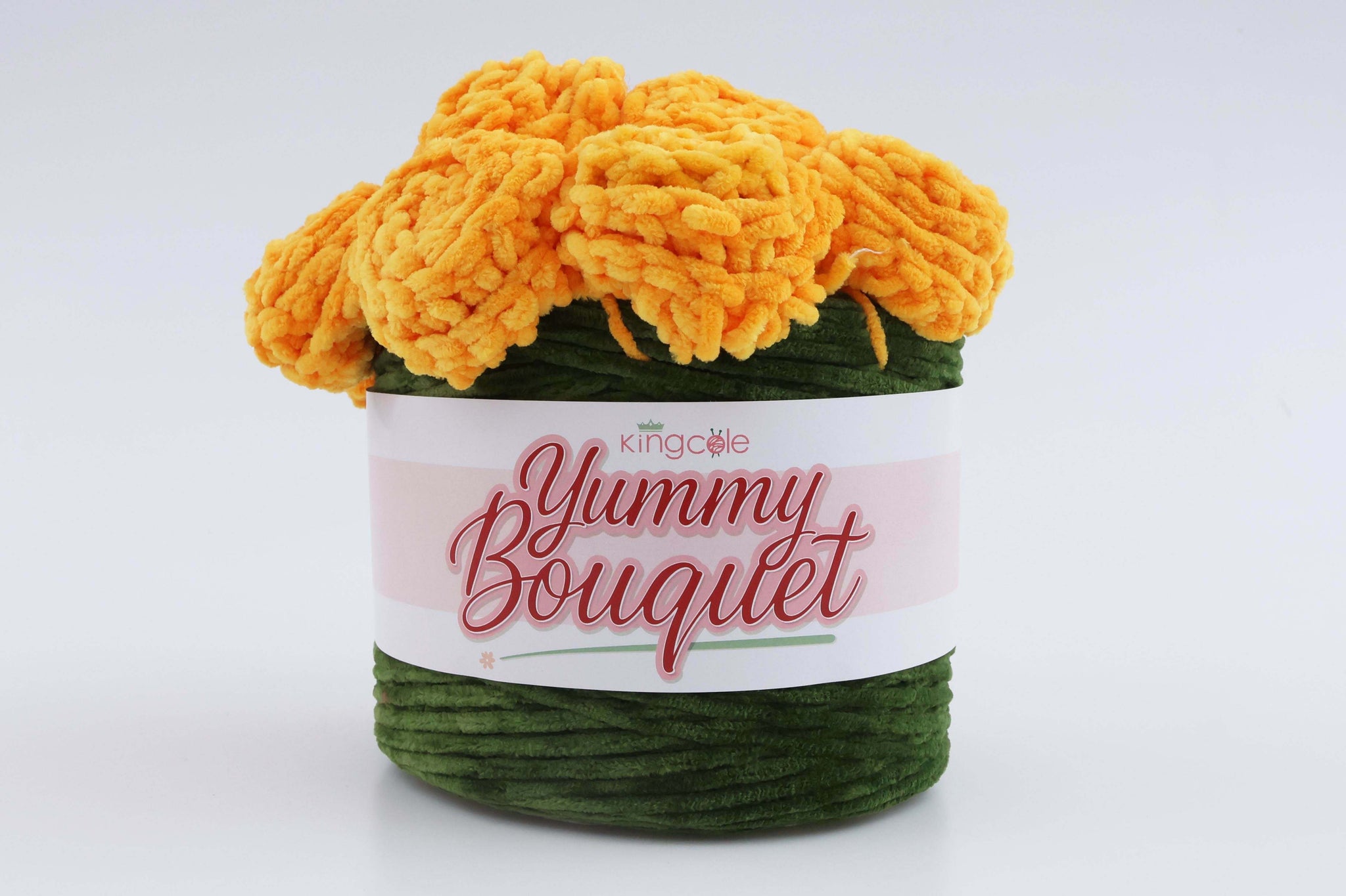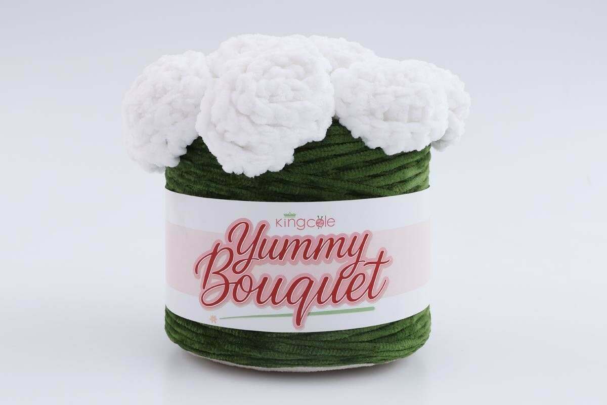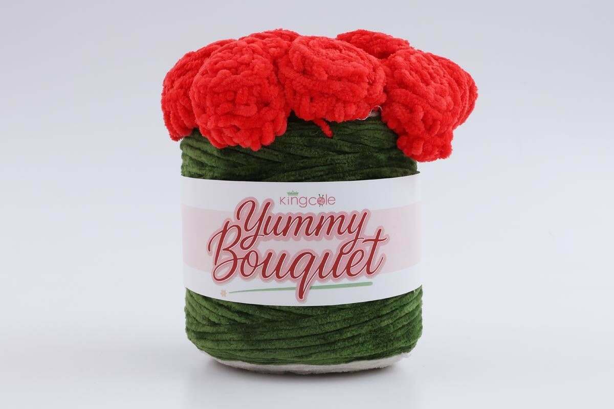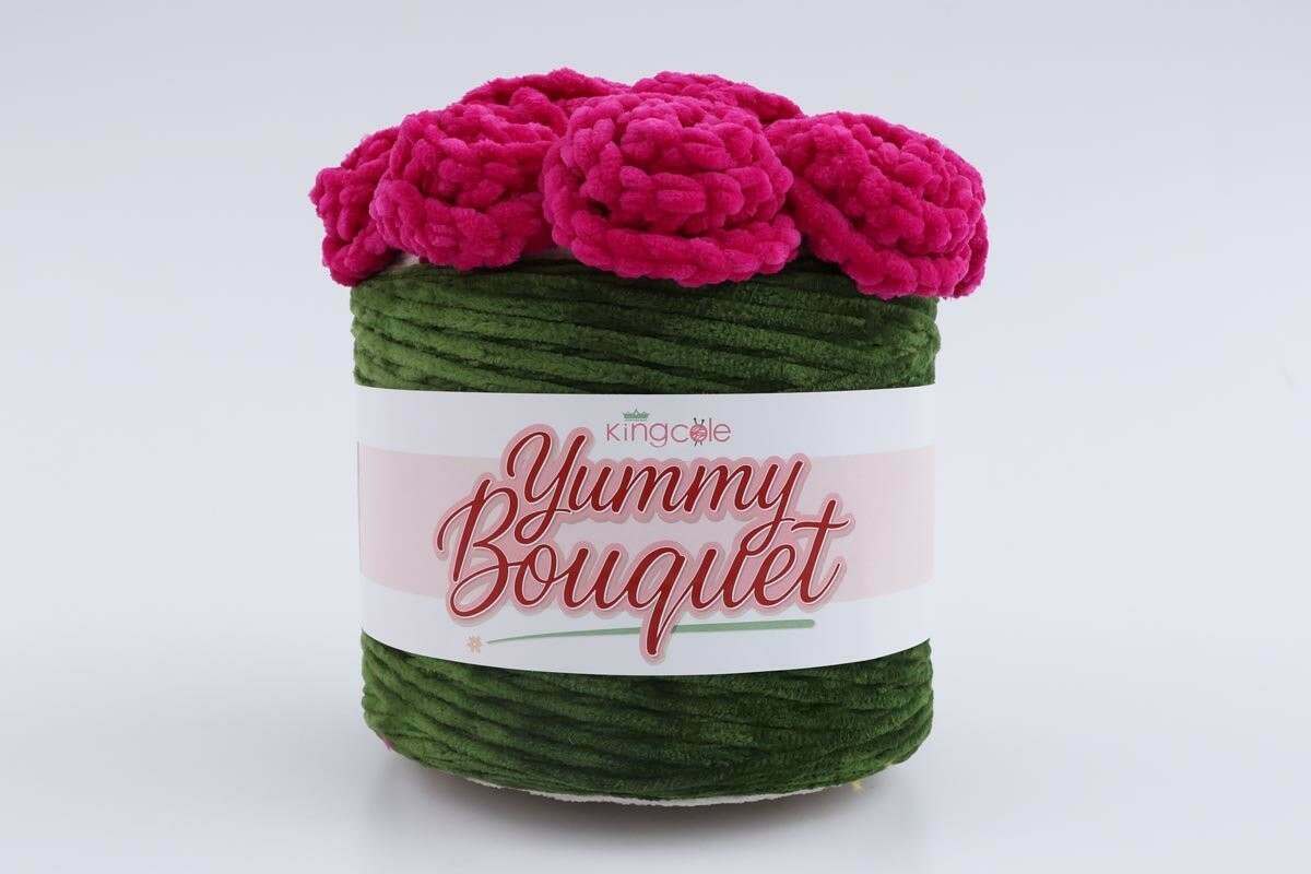 The Yummy Bouquet by King Cole consists of a sizable and distinctive cake of chenille yarn featuring a unique design. This cake resembles a flowering plant and, when crafted, transforms into a cosy  blanket that can be folded into a bouquet form. This design is ideal for gifting as it offers longevity.